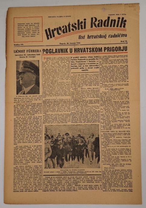 Časopis Hrvatski radnik br. 15/1944.list hrvatskog radništva Glavni urednik: Vjekoslav Blaškov Stranica: 8Dimenzije: 31.5x47Jezik: ZagrebPismo: LatinicaStanje: Vrlo dobroUvez: MekiGodina: 1944