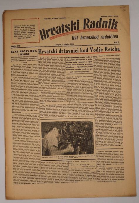 Časopis Hrvatski radnik br. 9/1944.list hrvatskog radništva Glavni urednik: Vjekoslav Blaškov Stranica: 8Dimenzije: 31.5x47Jezik: ZagrebPismo: LatinicaStanje: Vrlo dobroUvez: MekiGodina: 1944
