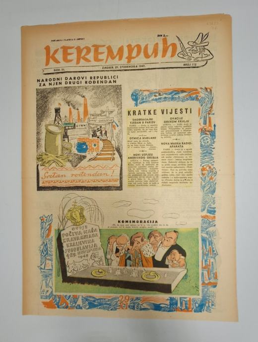 Časopis Kerempuh br. 112/1947.Glavni urednik: Fadil HadžićStranica: 4Dimenzije: 32x46Jezik: ZagrebPismo: LatinicaStanje: OdličnoUvez: MekiGodina: 1947