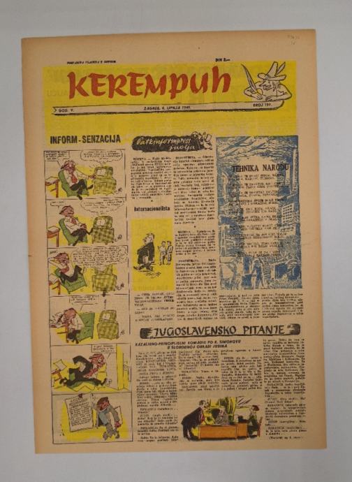 Časopis Kerempuh br. 191/1949.Glavni i odgovorni urednik: Fadil HadžićStranica: 4Dimenzije: 31.5x45Jezik: ZagrebPismo: LatinicaStanje: OdličnoUvez: MekiGodina: 1949