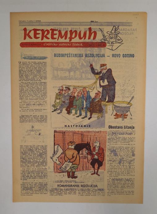 Časopis Kerempuh br. 219/1949.Glavni i odgovorni urednik: Fadil HadžićStranica: 4Dimenzije: 31.5x45Jezik: ZagrebPismo: LatinicaStanje: OdličnoUvez: MekiGodina: 1949