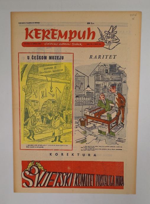 Časopis Kerempuh br. 244/1950.Glavni i odgovorni urednik: Fadil HadžićStranica: 4Dimenzije: 31.5x45Jezik: ZagrebPismo: LatinicaStanje: DobroUvez: MekiGodina: 1950