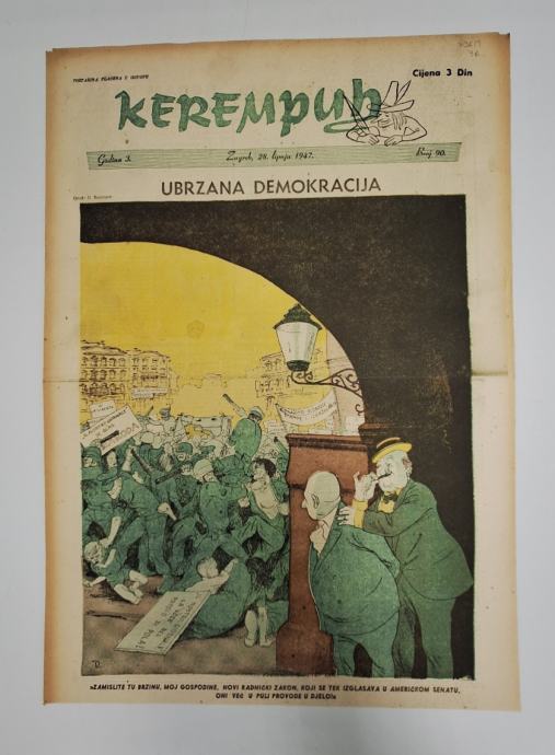 Časopis Kerempuh br. 90/1947.Glavni urednik: Fadil HadžićStranica: 8Dimenzije: 32x46Jezik: ZagrebPismo: LatinicaStanje: OdličnoUvez: MekiGodina: 1947