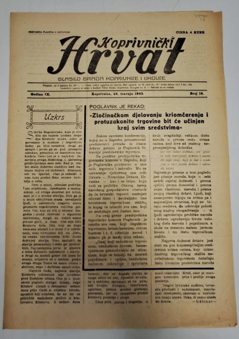 Časopis Koprivnički Hrvat br. 16/1943.Glasilo grada Koprivnice i okolice Glavni i odgovorni urednik: Martin NemecStranica: 4Dimenzije: 29x43Jezik: KoprivnicaPismo: LatinicaStanje: Vrlo dobroUvez: MekiGodina: 1943