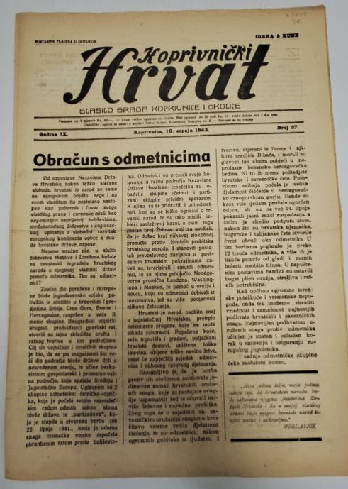 Časopis Koprivnički Hrvat br. 27/1943.Glasilo grada Koprivnice i okolice Glavni i odgovorni urednik: Martin NemecStranica: 4Dimenzije: 29x43Jezik: KoprivnicaPismo: LatinicaStanje: Vrlo dobroUvez: MekiGodina: 1943