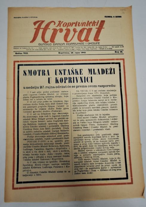 Časopis Koprivnički Hrvat br. 38/1943.Glasilo grada Koprivnice i okolice Glavni i odgovorni urednik: Martin NemecStranica: 4Dimenzije: 29x43Jezik: KoprivnicaPismo: LatinicaStanje: Vrlo dobroUvez: MekiGodina: 1943