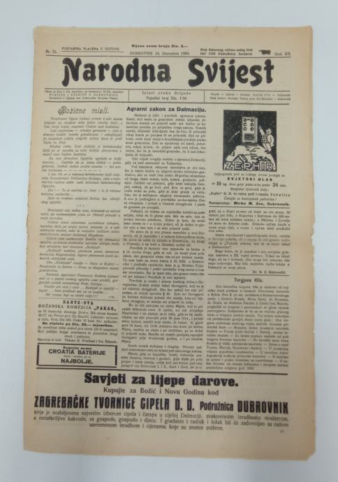 Časopis Narodna svijest br. 51/1930.Urednik: Antun FleIzlazi svake srijedeBožićni prilog.Stranica: 20Dimenzije: 32x47.5Jezik: DubrovnikPismo: LatinicaStanje: Vrlo dobroUvez: MekiGodina: 1930