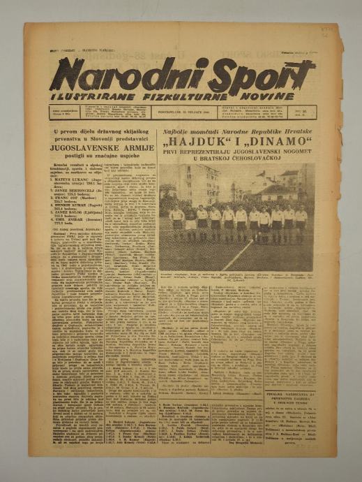 Časopis Narodni sport br. 30/1946.Ilustrirane fiskulturne novineGlavni i odgovorni urednik: Miroslav Habunek Stranica: 8Dimenzije: 31.5x45Jezik: ZagrebPismo: LatinicaStanje: Vrlo dobroUvez: MekiGodina: 1946