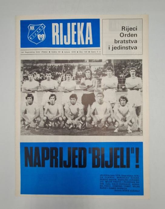 Časopis NK Rijeka 134/1978Glavni urednik: Miloš CvijanovićStranica: 16Dimenzije: 29x40Jezik: RijekaPismo: LatinicaStanje: Vrlo dobroUvez: MekiGodina: 1978