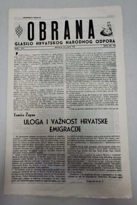 Časopis Obrana br. 123-124/1970.Glasilo hrvatskog narodnog odporaUređuje: radni skup Stranica: 16Dimenzije: 25x40Jezik: MadridPismo: LatinicaStanje: Vrlo dobroUvez: MekiGodina: 1970