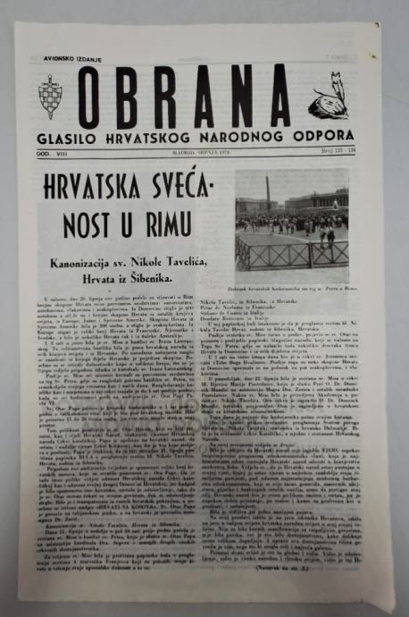 Časopis Obrana br. 133-134/1970.Glasilo hrvatskog narodnog odporaUređuje: radni skup Stranica: 16Dimenzije: 25x40Jezik: MadridPismo: LatinicaStanje: Vrlo dobroUvez: MekiGodina: 1970