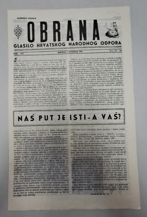 Časopis Obrana br. 139-140/1970.Glasilo hrvatskog narodnog odporaUređuje: radni skup Stranica: 16Dimenzije: 25x40Jezik: MadridPismo: LatinicaStanje: Vrlo dobroUvez: MekiGodina: 1970