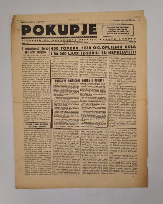 Časopis Pokupje br. 24/1945Vjestnik za suvremena pitanja, zabavu i poukuUrednik: Vjekoslav KružićStranica: 4Dimenzije: 31.5x44Jezik: KarlovacPismo: LatinicaStanje: DobroUvez: MekiGodina: 1945