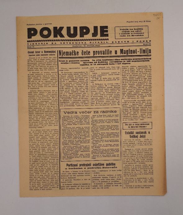 Časopis Pokupje br. 25/1945Vjestnik za suvremena pitanja, zabavu i poukuUrednik: Vjekoslav KružićStranica: 4Dimenzije: 31.5x44Jezik: KarlovacPismo: LatinicaStanje: DobroUvez: MekiGodina: 1945