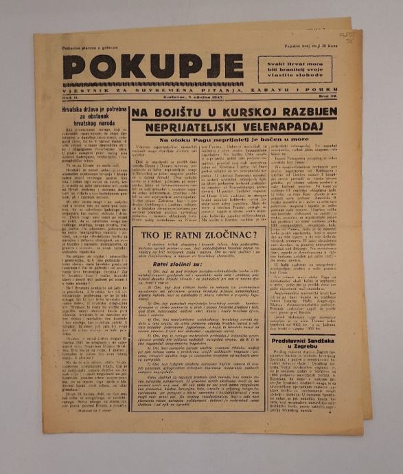 Časopis Pokupje br. 39/1945Vjestnik za suvremena pitanja, zabavu i poukuUrednik: Vjekoslav KružićStranica: 4Dimenzije: 31.5x44Jezik: KarlovacPismo: LatinicaStanje: DobroUvez: MekiGodina: 1945