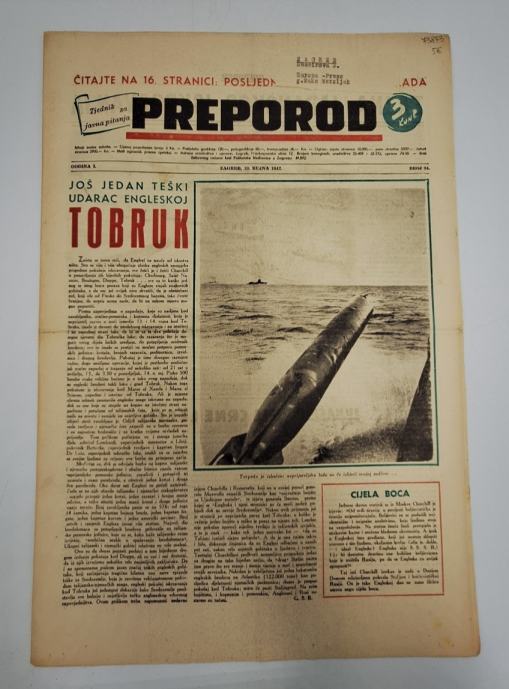 Časopis Preporod br. 34/1942Tjednik za javna pitanjaUrednik Dragan TežakStranica: 16Dimenzije: 32x47Jezik: ZagrebPismo: LatinicaStanje: Vrlo dobroUvez: MekiGodina: 1942