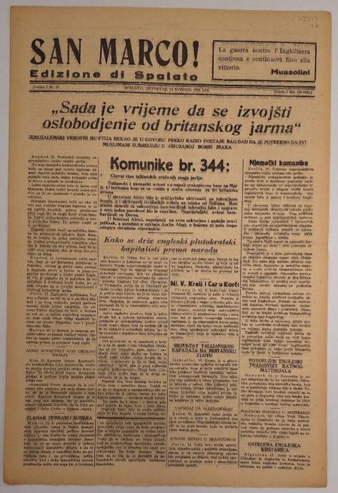 Časopis San Marco! 15/1941Edizione di SpalatoUrednik: Antonio Just-VerdusDvojezične dnevne novine koje su izlazile za vrijeme talijanske okupacije Splita od 1941. do 1943.Stranica: 4Dimenzije: 31.5x46.5Jezik: SplitPismo: LatinicaStanje: Vrlo dobroUvez: MekiGodina: 1941