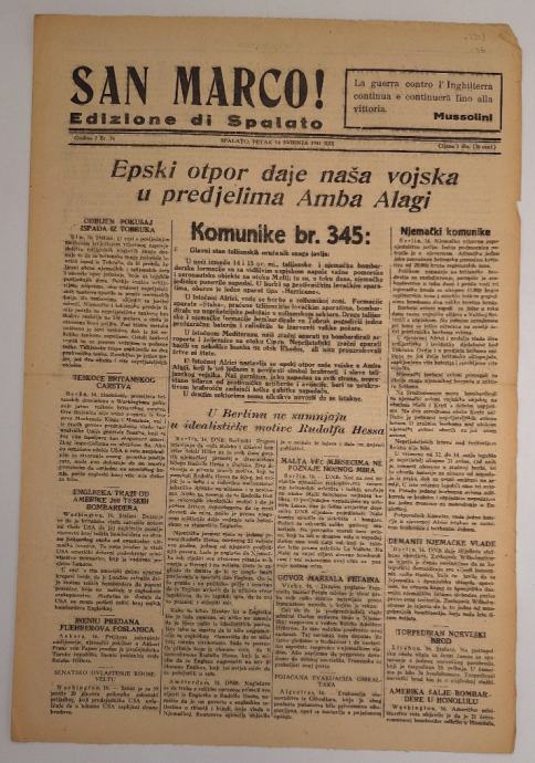 Časopis San Marco! 16/1941Edizione di SpalatoUrednik: Antonio Just-VerdusDvojezične dnevne novine koje su izlazile za vrijeme talijanske okupacije Splita od 1941. do 1943.Stranica: 4Dimenzije: 31.5x46.5Jezik: SplitPismo: LatinicaStanje: Vrlo dobroUvez: MekiGodina: 1941