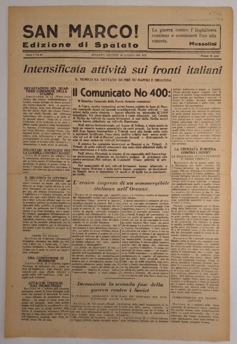 Časopis San Marco! 60/1941Edizione di SpalatoUrednik: Antonio Just-VerdusDvojezične dnevne novine koje su izlazile za vrijeme talijanske okupacije Splita od 1941. do 1943.Stranica: 8Dimenzije: 31.5x46.5Jezik: SplitPismo: LatinicaStanje: Vrlo dobroUvez: MekiGodina: 1941