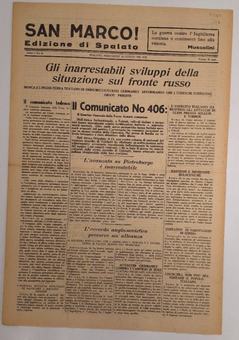 Časopis San Marco! 65/1941Edizione di SpalatoUrednik: Antonio Just-VerdusDvojezične dnevne novine koje su izlazile za vrijeme talijanske okupacije Splita od 1941. do 1943.Stranica: 8Dimenzije: 31.5x46.5Jezik: SplitPismo: LatinicaStanje: Vrlo dobroUvez: MekiGodina: 1941