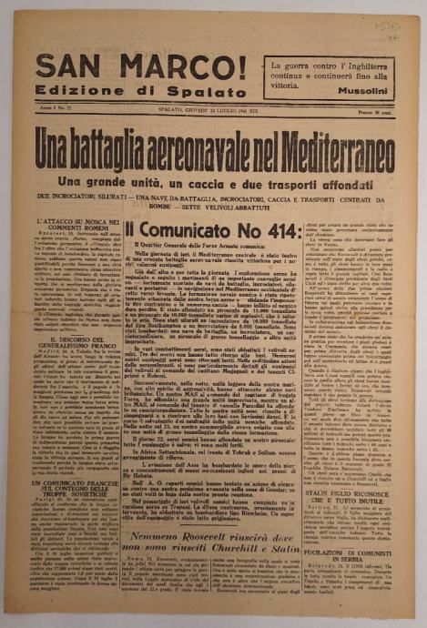 Časopis San Marco! 72/1941Edizione di SpalatoUrednik: Antonio Just-VerdusDvojezične dnevne novine koje su izlazile za vrijeme talijanske okupacije Splita od 1941. do 1943.Stranica: 8Dimenzije: 31.5x46.5Jezik: SplitPismo: LatinicaStanje: Vrlo dobroUvez: MekiGodina: 1941