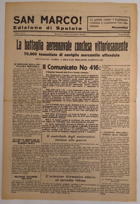 Časopis San Marco! 74/1941Edizione di SpalatoUrednik: Antonio Just-VerdusDvojezične dnevne novine koje su izlazile za vrijeme talijanske okupacije Splita od 1941. do 1943.Stranica: 8Dimenzije: 31.5x46.5Jezik: SplitPismo: LatinicaStanje: Vrlo dobroUvez: MekiGodina: 1941