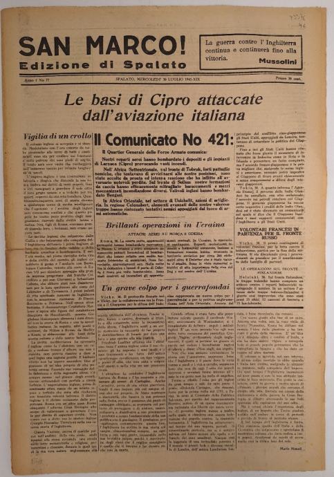 Časopis San Marco! 77/1941Edizione di SpalatoUrednik: Antonio Just-VerdusDvojezične dnevne novine koje su izlazile za vrijeme talijanske okupacije Splita od 1941. do 1943.Stranica: 8Dimenzije: 31.5x46.5Jezik: SplitPismo: LatinicaStanje: Vrlo dobroUvez: MekiGodina: 1941