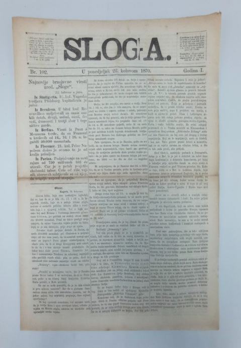 Časopis Sloga br. 102/1870.Izdavatelj i odgovorni urednik: Stjepan PavišićTiskom Drag. Albrechta u ZagrebuStranica: 4Dimenzije: 31x47Jezik: ZagrebPismo: LatinicaStanje: DobroUvez: MekiGodina: 1870