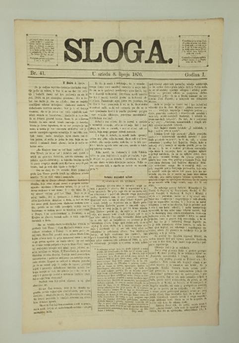 Časopis Sloga br. 41/1870.Izdavatelj i odgovorni urednik: Stjepan PavišićTiskom Drag. Albrechta u ZagrebuStranica: 4Dimenzije: 31x47Jezik: ZagrebPismo: LatinicaStanje: DobroUvez: MekiGodina: 1870