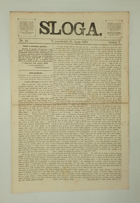 Časopis Sloga br. 50/1870.Izdavatelj i odgovorni urednik: Stjepan PavišićTiskom Drag. Albrechta u ZagrebuStranica: 4Dimenzije: 31x47Jezik: ZagrebPismo: LatinicaStanje: DobroUvez: MekiGodina: 1870