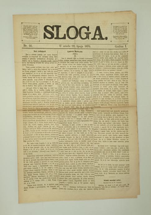 Časopis Sloga br. 52/1870.Izdavatelj i odgovorni urednik: Stjepan PavišićTiskom Drag. Albrechta u ZagrebuStranica: 4Dimenzije: 31x47Jezik: ZagrebPismo: LatinicaStanje: DobroUvez: MekiGodina: 1870