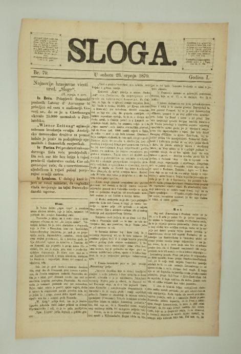 Časopis Sloga br. 79/1870.Izdavatelj i odgovorni urednik: Stjepan PavišićTiskom Drag. Albrechta u ZagrebuStranica: 4Dimenzije: 31x47Jezik: ZagrebPismo: LatinicaStanje: DobroUvez: MekiGodina: 1870