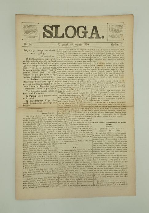 Časopis Sloga br. 84/1870.Izdavatelj i odgovorni urednik: Stjepan PavišićTiskom Drag. Albrechta u ZagrebuStranica: 4Dimenzije: 31x47Jezik: ZagrebPismo: LatinicaStanje: DobroUvez: MekiGodina: 1870
