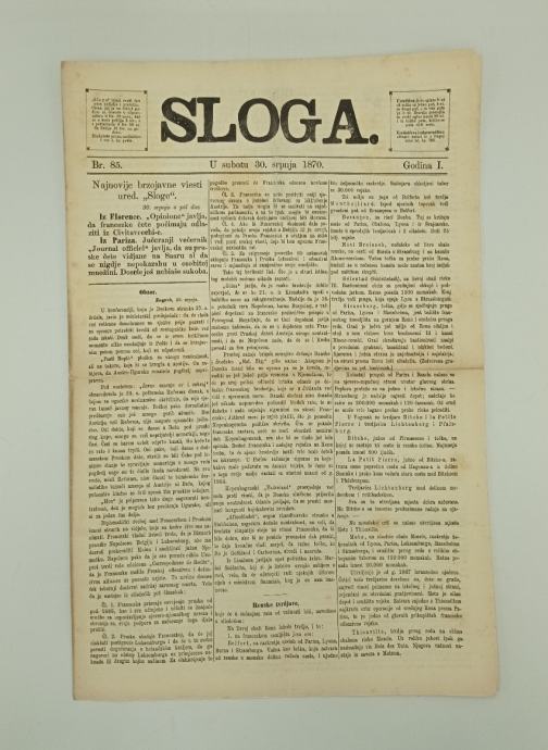 Časopis Sloga br. 85/1870.Izdavatelj i odgovorni urednik: Stjepan PavišićTiskom Drag. Albrechta u ZagrebuStranica: 4Dimenzije: 31x47Jezik: ZagrebPismo: LatinicaStanje: DobroUvez: MekiGodina: 1870