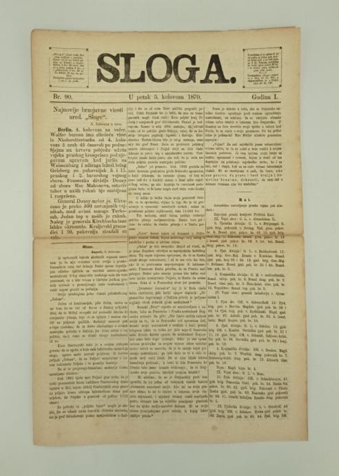 Časopis Sloga br. 90/1870.Izdavatelj i odgovorni urednik: Stjepan PavišićTiskom Drag. Albrechta u ZagrebuStranica: 4Dimenzije: 31x47Jezik: ZagrebPismo: LatinicaStanje: DobroUvez: MekiGodina: 1870