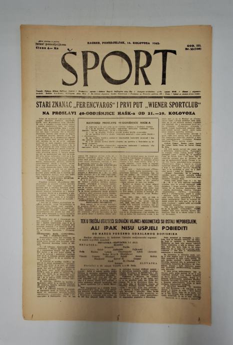 Časopis Šport 33/1943Glavni i odgovorni urednik: Božidar SarkanjStranica: 8Dimenzije: 30.5x47Jezik: ZagrebPismo: LatinicaStanje: DobroUvez: MekiGodina: 1943