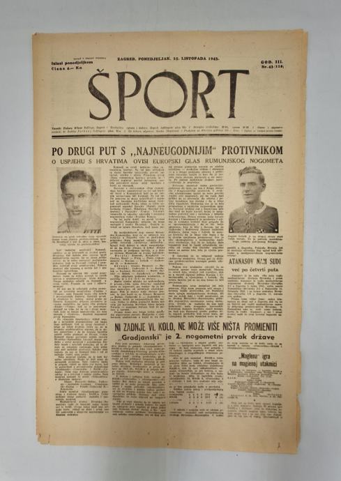 Časopis Šport 43/1943Glavni i odgovorni urednik: Božidar SarkanjStranica: 8Dimenzije: 30.5x47Jezik: ZagrebPismo: LatinicaStanje: DobroUvez: MekiGodina: 1943