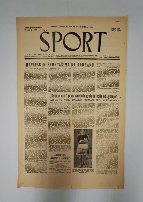 Časopis Šport 46/1943Glavni i odgovorni urednik: Božidar SarkanjStranica: 6Dimenzije: 30.5x47Jezik: ZagrebPismo: LatinicaStanje: DobroUvez: MekiGodina: 1943