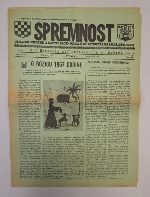 Časopis Spremnost br. 101/1967Glasilo Hrvata Australije - Organ Of Croatians In AustraliaStranica: 12Dimenzije: 27x37Jezik: SydneyPismo: LatinicaStanje: DobroUvez: MekiGodina: 1967