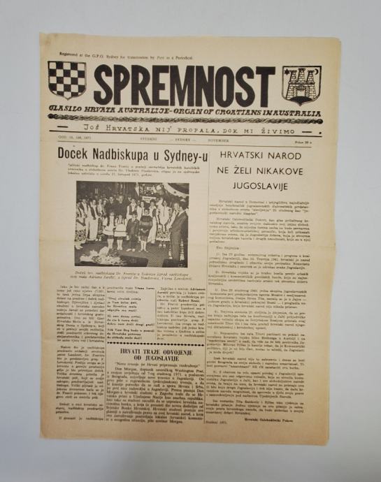 Časopis Spremnost br. 148/1971Glasilo Hrvata Australije - Organ Of Croatians In AustraliaUrednik: F. LovokovićStranica: 8Dimenzije: 27x37Jezik: SydneyPismo: LatinicaStanje: DobroUvez: MekiGodina: 1971