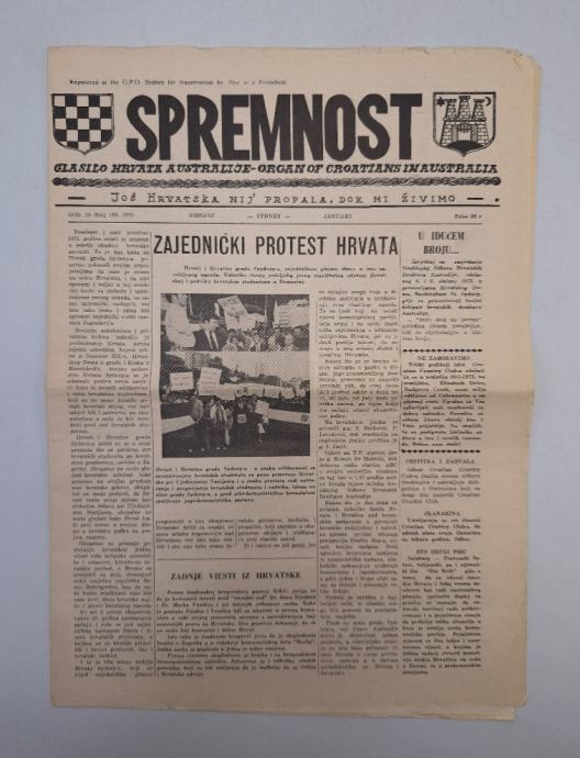 Časopis Spremnost br. 150/1972Glasilo Hrvata Australije - Organ Of Croatians In AustraliaUrednik: F. LovokovićStranica: 8Dimenzije: 27x37Jezik: SydneyPismo: LatinicaStanje: DobroUvez: MekiGodina: 1972