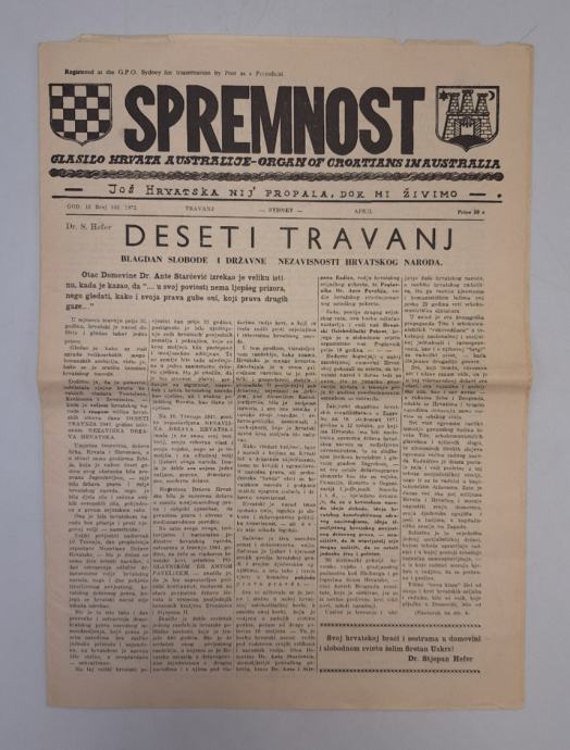Časopis Spremnost br. 153/1972Glasilo Hrvata Australije - Organ Of Croatians In AustraliaUrednik: F. LovokovićStranica: 10Dimenzije: 27x37Jezik: SydneyPismo: LatinicaStanje: DobroUvez: MekiGodina: 1972