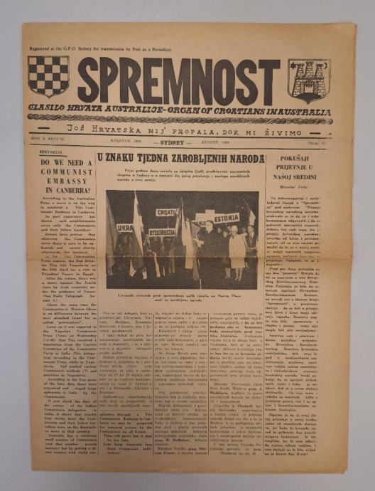 Časopis Spremnost br. 85/1966Glasilo Hrvata Australije - Organ Of Croatians In AustraliaStranica: 8Dimenzije: 27x37Jezik: SydneyPismo: LatinicaStanje: DobroUvez: MekiGodina: 1966