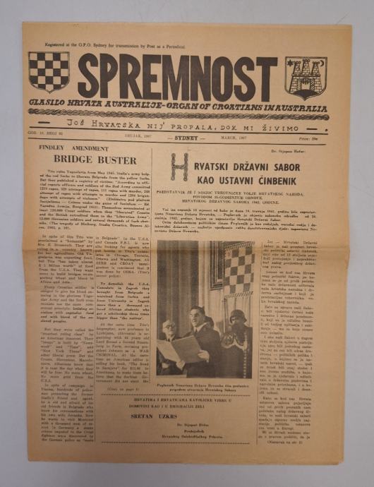 Časopis Spremnost br. 92/1967Glasilo Hrvata Australije - Organ Of Croatians In AustraliaStranica: 8Dimenzije: 27x37Jezik: SydneyPismo: LatinicaStanje: DobroUvez: MekiGodina: 1967