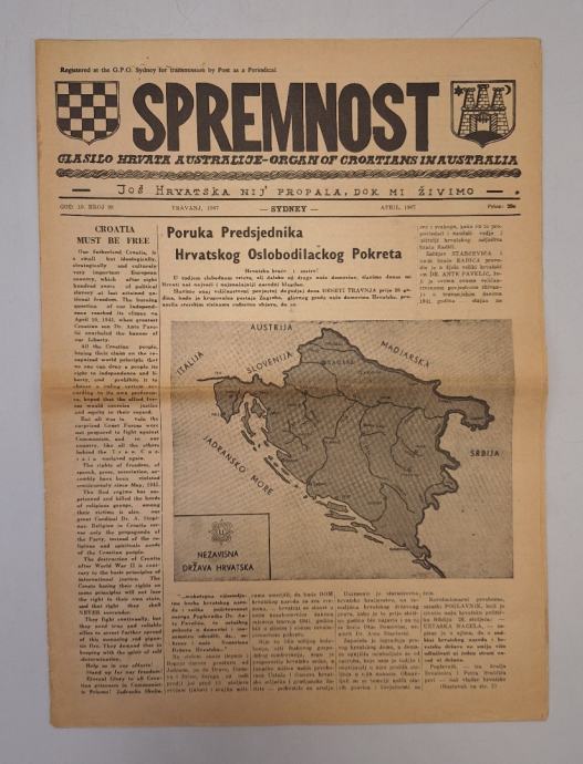 Časopis Spremnost br. 93/1967Glasilo Hrvata Australije - Organ Of Croatians In AustraliaStranica: 12Dimenzije: 27x37Jezik: SydneyPismo: LatinicaStanje: DobroUvez: MekiGodina: 1967