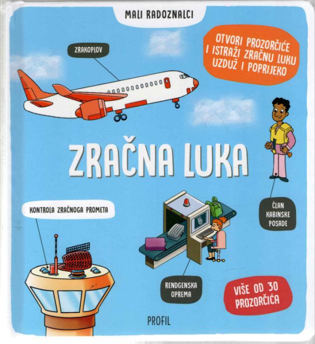 Krenimo na putovanje kroz različita područja zračne luke i prije nego što se uputite na pravi let. Saznajmo više o tome što se događa u zračnoj luci i upoznajmo neke od nevjerojatnih ljudi koji su ondje zaposleni. Otvorite prozorčiće i doznajte kako prtljaga stigne iz jedne zračne luke u drugu, naučite kako kontrolori zračnog prometa prate zrakoplove i saznajte kako funkcionira rendgenska oprema. Otkrijte kako životinje pomažu tijekom sigurnosne kontrole putnika i njihove prtljage te kako se kabinska posada brine da putnicima let prođe ugodno i sigurno. Slikovnica sadrži više od 30 prozorčića ispod kojih se kriju informacije i zanimljivosti o brojnim zanimanjima, važnim procedurama, aktivnostima, neizbježnim zadatcima koji se odvijaju u zračnoj luci. Izrađena je od visokokvalitetnog kartona, što je čini izuzetno izdržljivom za sve radoznalce koji će prebirati po knjizi i prozorčićima i tako štošta doznati i naučiti o svemu što se događa u zračnoj luci.Stranica: 16Dimenzije: 22,7 x 20,7 cmJezik: ZagrebPismo: LatinicaStanje: Nova knjigaUvez: TvrdiGodina: 2024
