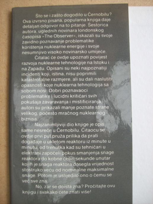 Šta se i zašto dogodilo u Černobilu? Ova izvrsno pisana popularna knjiga daje detaljan odgovor na to pitanje. Šestorica autora, uglednih novinara londonskog časopisa " The Observer", iskazali su svoje zavidno poznavanje problematike korištenja nuklearne energije i svoje nesumljivo visoko novinarsko umijeće. Čitalac će ovdje upoznati povijest razvoja nuklearne tehnologije na Istoku i na Zapadu.Opisani su neki najpoznatiji incidenti koji, istina, nisu poprimili katastrofalne razmjere, ali su dali naslutiti opasnosti koje nuklearna tehnologija sa sobom nosi. Dobri poznavaoci problematike i lucidni kritičari svih pokušaja zavaravanja i mistificiranja, autori su prikazali manje poznate strane velikog, počesto mračnog nuklearnog biznisa. Najzanimljiviji dio knjige je opis same nesreće u Černobilu. Čitaocu se ovdje prvi put pruža prilika da prati događeje u ukletom reaktoru iz minute u minutu, od trenutka kad su tehničari u elektrani započeli pokus smanjenja snage reaktora do kobne četiri sekunde unutar kojih je snaga reaktora dosegla vrijednost stostruko veću od nominalne maksimalne snage. Potom je uslijedilo ono o čemu se već sve zna. No, zar se doista zna? Pročitajte ovu knjigu i svakako ćete znati više!