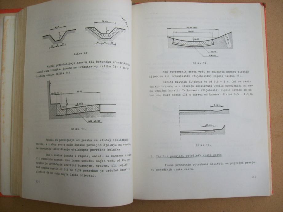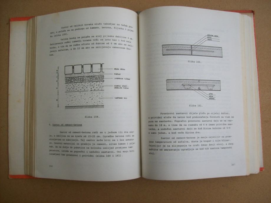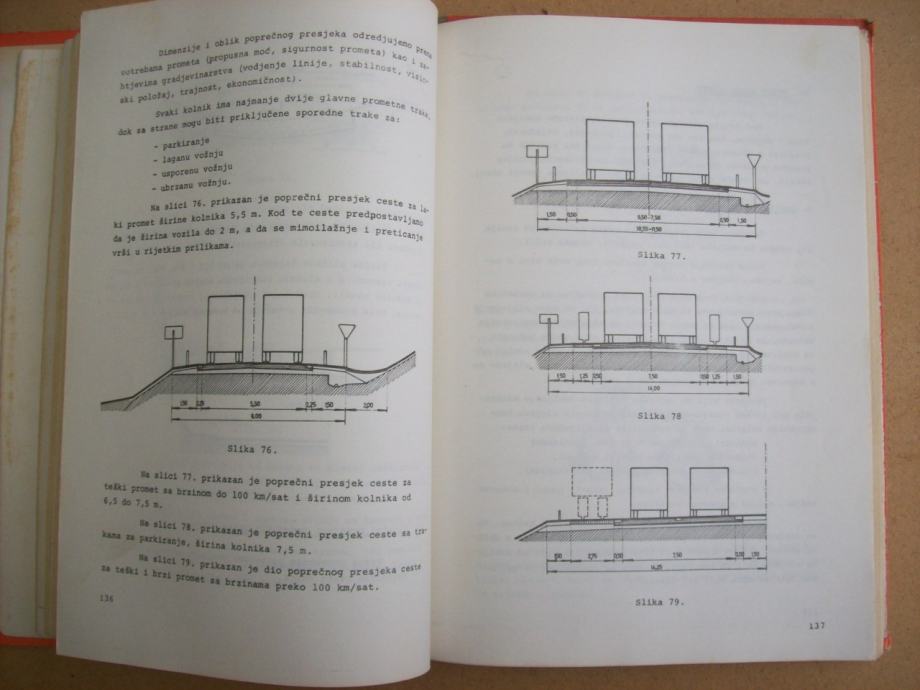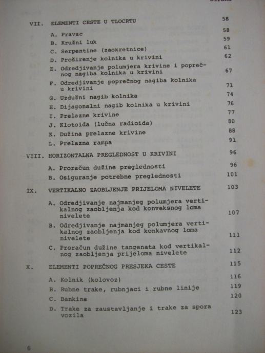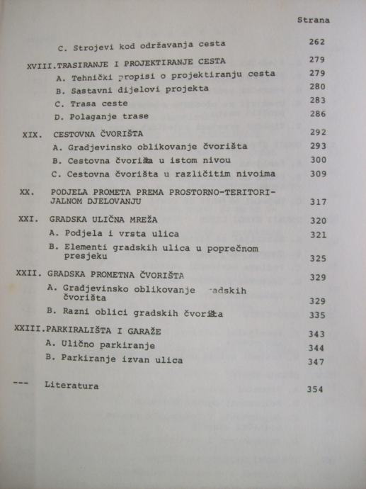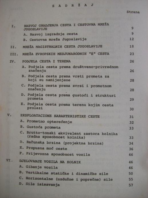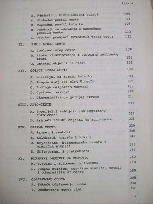 Razvoj izgradnje cesta, Podela cesta i terena, Eksploatacione karakteristike ceste, Delovanje vozila na kolnik, Gibanje vozila, Elementi ceste u klokotu, Horizontalna preglednost u krivini, Vertikalno zaobljenje preloma nivelete, Elementi poprecnog preseka ceste, Bankine, Donji i gornji sloj ceste, Autoputevi, Oprema ceste, Održavanje cesta, Trasiranje i projektovanje cesta, Cestovna cvorišta, Gradska ulicna mreža, Gradska prometna cvorišta, Parkirališta i garaže, .. .