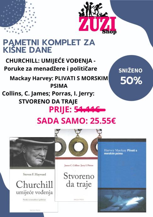 CHURCHILL: UMIJEĆE VOĐENJA - Poruke za menadžere i političare Američki politolog neokonzervativne ideologije kroz analizu Churchillova poslovodnog stila nudi uvide o ulozi vođenja u modernim organizacijama. Moderna korporacija složen je organizacijski sustav koji vodi svojevrsni rat na tržištu. Stoga je legitimno na to područje aplicirati i spoznaje i iskustva stečena u drugim srodnim arenama, kao što su područja rata i politike. Collins, C. James; Porras, I. Jerry: STVORENO DA TRAJE ‘Stvoreno da traje’ ne govori o stvaranju da bi nešto potrajalo. Govori o stvaranju nečega što je vrijedno da traje – o stvaranju kompanije takve istinske izvrsnosti da bi svijet izgubio nešto važno kada bi ta organizacija prestala postojati. Na svakoj je stranici implicitno jednostavno pitanje: zašto biste se, zaboga, zadovoljili stvaranjem nečega osrednjega što samo donosi novac, kada možete stvoriti nešto izvanredno što uz to daje trajan doprinos? I na kraju, kako su pokazali podaci iz istraživanja autora, oni koji stvaraju trajan doprinos ionako dugoročno zarađuju više. Mackay Harvey: PLIVATI S MORSKIM PSIMA Jedna od najinspirativnijih poslovnih knjiga svih vremena. Nadmašite svoje konkurente prodajom, vođenjem i pregovaranjem. Ako ste upravo otvorili ovu knjigu ne znajući što biste od nje očekivali, pripremite se za veliki užitak. ‘Plivati s morskim psima i sačuvati živu glavu’ nije jedna od onih beskorisnih zbirki otrcanih mudrosti poslovnih škola, već sjajna škrinja s blagom, puna informacija koje možete odmah primijeniti u svojem poslu, životu, odnosima s ljudima te tako ostvariti svoje ciljeve.Jezik: ZagrebPismo: LatinicaStanje: Nova knjigaUvez: Tvrdi