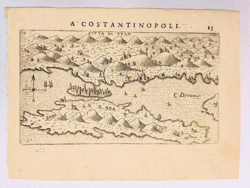 Giuseppe Rosaccio: Citta di Trau / Veduta Trogira BakrorezIz djela: Viaggio da Venetia, a Costantinopoli : per mare, e per terra & insieme quello di Terra Santa, Venice, Giacomo Franco, 1598Veduta Grada Trogira i okolici smatra se remek-djelom u grafičkom smislu jer obiluje informacijama. Prikazuje otok Čiovo, grad Trogir i trogirsko zaleđe. Na otoku Čiovu prikazano je nekoliko crkvica, dok se u zelđeu trogira raspoznaju Kaštelanska sela te Radošić polje. Unutra grada Trogira ucrtana je kula Sv. Marka i Katedrala Sv. Ivana s zvonikom. Također se može prepoznati i Kamerlengo. Veduta Grada Trogira i okolici smatra se remek-djelom u grafičkom smislu jer obiluje informacijama. Giuseppe Rosaccio (cca. 1530-1620): talijanski liječnik, putopisac, geograf, kozmograf i kartograf. Studirao je filozofiju, medicinu i pravo na Sveučilišu u Padovi, stekavši naslov doktora. Zbog posla je otišao u gradić Tricesimu, gdje je prema Lirutiju, živio od 1552. obavljajući ne samo liječničku službu, nego i druge gradske službe. Bio je sudac u građanskim parnicama. Autor je četrdesetak što većih što manjih djela. Značajna djela su Viaggio da Venetia a Constantinopoli per mare e per terra iz 1574., Al Sereniss. Cosmo Gra Principe di Toscana, il viaggio per Mare, e per terra di Constantinopoli, e di tera Santa iz 1601.Osim izdanja iz 1574. biografi navode izdanja iz 1598, 1601, 1604, 1606. Sva su izdanja ilustrirana bakroreznim vedutama gradova, otoka, tvrđava i sl.Te ilustracije danas se smatraju najvećom vrijednošću tih djela, te predstavljaju najstarije i najobuhvatnije grafičke prikaze hrvatskih krajeva i gradova. U izdanju iz 1606. nalaze se karte Istre, otoka Raba, Paga, Hvara, Korčule, karte Splita i Trogira, vedute Rovinja, Pule, Osora, Šibenika, Skradina, Klisa, zatim planovi Zadra i Dubrovnika.Stranica: -Dimenzije: 17.5x10.4; 21x15.8Jezik: VenecijaPismo: LatinicaStanje: OdličnoGodina: 1598